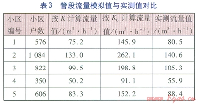 為了驗證計算得到的同時工作系數(shù)的準(zhǔn)確性,下面分別利用同時工作系數(shù)K與K計算該地區(qū)5個小區(qū)的管段流量,并將結(jié)果與實測流量值進行對比,見表3。