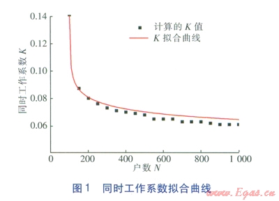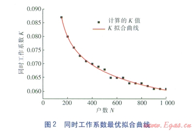 此式仍然滿足同時工作系數(shù)的一般規(guī)律,而且加冪運算使得K隨Ⅳ的變化而變化的敏感性提高。當(dāng)置信區(qū)間P較小時,計算誤差對整個運算的影響逐漸減小,故而造成的波動也越來越小。針對此地區(qū)的同時工作系數(shù)在置信區(qū)間P=[0.99,1)時,將計算出來的離散數(shù)據(jù)擬合成曲線的函數(shù)關(guān)系,將表1中的數(shù)據(jù)作為依據(jù)進行擬合,得到戶數(shù)與同時工作系數(shù)的擬合結(jié)果,見圖1。