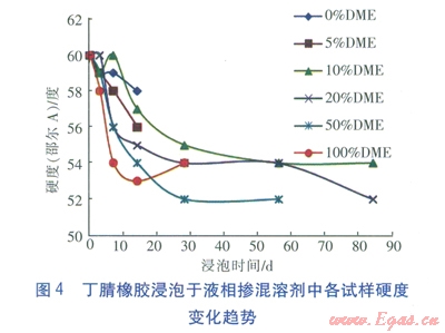 ①液相摻混溶劑對(duì)丁腈橡膠的硬度影響較?。豢傮w上隨著浸泡時(shí)間的增長(zhǎng),硬度有所減小。