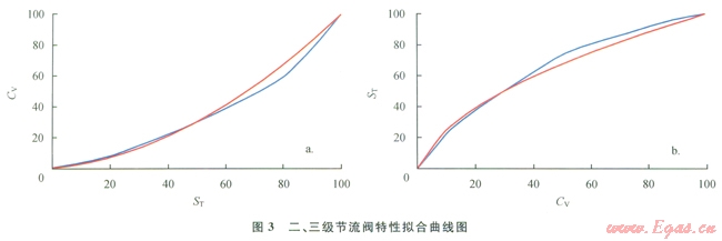 繪制擬合曲線和線性化補(bǔ)償反函數(shù)曲線(圖3)。二級(jí)節(jié)流閥開度(ST)與流量系數(shù)(CV)存在圖3-a藍(lán)色曲線所示關(guān)系,曲線表明兩者關(guān)系非線性比較嚴(yán)重,不利于流量均勻準(zhǔn)確控制,必須進(jìn)行線性化,以達(dá)到智能線性解耦控制。