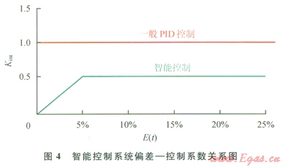 可見,采用智能控制,可使偏差快速穩(wěn)定收斂,當(dāng)[å|e(t)|/n]/Yset≥5%時(shí),采用固定比例控制,當(dāng)[å|e(t)|/n]/Yset≤5%時(shí),采用一定時(shí)間(大約0.5個(gè)波動(dòng)周期)相對(duì)偏差絕對(duì)值的均值(10/Yset)[ å|e(t)|/n]作為改變控制量的隨機(jī)變動(dòng)系數(shù),智能系數(shù)Kint,與E(t)在5%以下時(shí)呈線性遞增關(guān)系,控制量u(t)與E(t)呈非線性遞增關(guān)系。