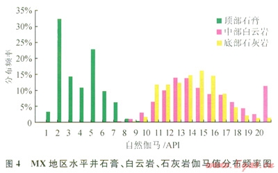 伽馬值衡量的是地層中放射性物質(zhì)含量,對(duì)儲(chǔ)層判別基本不起作用。但根據(jù)MX地區(qū)區(qū)域資料,自然伽馬能有效識(shí)別出儲(chǔ)層頂部石膏層。如圖4所示,頂部石膏的伽馬值主要集中在1~8API,而中部白云巖的伽馬值主要集中在8~20API,底部石灰?guī)r的伽馬值主要集中在9~l8API,石灰?guī)r、白云巖與石膏的差異非常明顯??捎?span lang="EN-US">8API作為石膏的輔助判別上限。