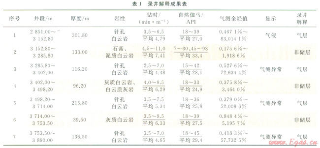 綜合前面的分析以及該井的實(shí)鉆情況,以巖屑、鉆時(shí)、氣測(cè)、伽馬作為錄井隨鉆評(píng)價(jià)的主要參數(shù),即通過(guò)對(duì)碳酸鹽巖分析結(jié)果、巖屑顯微觀察以及隨鉆伽馬曲線的綜合分析,準(zhǔn)確識(shí)別出正鉆地層巖性。再利用建立的儲(chǔ)層鉆時(shí)、氣測(cè)判別標(biāo)準(zhǔn),對(duì)儲(chǔ)層進(jìn)行識(shí)別和劃分(圖5、表l),結(jié)果如下。