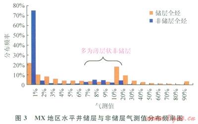 氣測(cè)值的影響因素頗多,用以判別儲(chǔ)層存在很大難度。但通過(guò)統(tǒng)計(jì)分析發(fā)現(xiàn),在MX地區(qū)的水平井,由于儲(chǔ)層段的平均孔隙度較高,其含氣量與非儲(chǔ)層存在明顯差異,加之MX地區(qū)屬于勘探成熟區(qū)塊且構(gòu)造平緩,使用的鉆井液性能基本一致,氣測(cè)值能有效地反映水平井儲(chǔ)層的發(fā)育狀況。