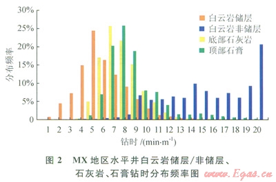 鉆時(shí)是儲(chǔ)層判別的重要參數(shù)。根據(jù)區(qū)域水平井資料,對(duì)目的層及其圍巖的鉆時(shí)進(jìn)行了統(tǒng)計(jì)分析。
