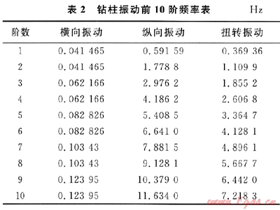 文中對鉆柱的振動模態(tài)分析擴展到20階模態(tài),但是根據(jù)大量研究試驗可知,10階模態(tài)就足以表明鉆柱的振動情況。表2列出了鉆柱橫向、縱向、扭轉(zhuǎn)振動的前10階頻率。