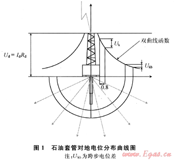 井架和石油套管遠遠超出常規(guī)的接地體尺寸,因此一般認為石油鉆機井架就是最好的巨型避雷針,石油套管就是最好的巨型接地體。當鉆臺上工頻下某相絕緣破壞或設(shè)備外殼帶電時,觸摸帶電設(shè)備外殼時的接觸電位為Ud,身體站立處的電位為U1:
