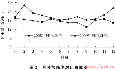 圖2為2008年和2009年LNG接收站月噸氣耗電對比圖,2009年的月平均噸氣耗電指標(biāo)相應(yīng)下降,但年度用氣高峰階段5~11月份的下降幅度低于12~4月份年度用氣低谷階段。