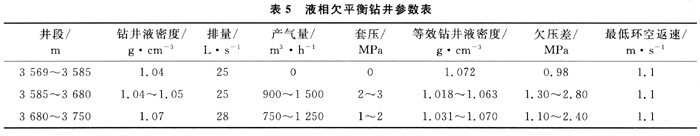 實際第三次開鉆欠平衡鉆進中,采用液相欠平衡技術(shù)達到了欠平衡條件,充氣設(shè)備一直待命未用。其施工過程可以分為兩個階段。