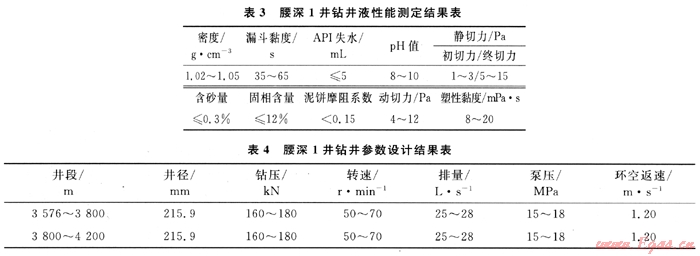 從腰深1井鄰井DB2井和DB11井情況來看:①DB2井在鉆進至嫩江組、姚家組地層時,出現(xiàn)垮塌掉塊現(xiàn)象;②DB11井鉆進至4002.07m時出現(xiàn)井內(nèi)垮塌現(xiàn)象,經(jīng)調(diào)整鉆井液性能后返出大量巖屑,井下才恢復(fù)正常。從腰深1井地層巖性預(yù)測結(jié)果可知,欠平衡鉆井井段存在泥巖層,易吸水膨脹而產(chǎn)生剝落掉塊、垮塌。從鄰井分析和腰深1井巖性預(yù)測均表明,在欠平衡井段應(yīng)選用防塌性能好的鉆井液體系,為此決定采用聚合醇抑制型防塌鉆井液體系。