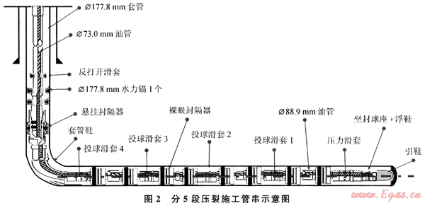 為了讓裂縫在壓裂段能集中起裂,蘇里格氣田多數(shù)以雙封隔器進(jìn)行單段壓裂,例如分5段使用8個(gè)裸眼封隔器,其壓裂施工管柱結(jié)構(gòu)如圖2所示,反打開滑套可在壓裂施工前打開,施工時(shí)以便監(jiān)測井底壓力。