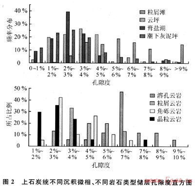 沉積微相是有利儲(chǔ)層發(fā)育的基礎(chǔ)。從沉積作用的角度來(lái)看,川東石炭系主要發(fā)育潮坪沉積體系,主要的沉積微相是粒屑灘、云坪、潮下灰泥坪、與膏鹽湖等沉積微相[14~15]。根據(jù)對(duì)這些沉積微相的儲(chǔ)層孔隙度等的統(tǒng)計(jì),展示粒屑灘微相的白云巖儲(chǔ)層物性最好(圖2上),孔隙度區(qū)間多介于3%~9%,部分可超過(guò)9%,這是因?yàn)榱P紴┎粌H存在一定的原始沉積孔隙,為埋藏期儲(chǔ)層的白云化、溶蝕作用的發(fā)生創(chuàng)造了有利條件,而且使溶蝕孔隙成為主要的儲(chǔ)集空間。其次是云坪微相,其孔隙度區(qū)間為1%~7%,也有部分超過(guò)9%;而潮下灰泥坪與膏鹽湖微相的儲(chǔ)層孔隙度多低于4%,只有少量為4%~9%。因此,粒屑灘沉積微相最有利儲(chǔ)層的形成,并對(duì)儲(chǔ)層的后期改善起到重要促進(jìn)作用。