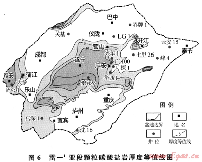 綜上所述,上述2套儲層的發(fā)育條件和區(qū)域分布不同,風(fēng)化殼型巖溶儲層受微相和巖溶作用的控制,縱向上分布在風(fēng)化殼下數(shù)十米范圍內(nèi),平面上分布于有利巖相和有利巖溶古地貌單元疊合部位,初步預(yù)測LG-營山-西充-遂寧是勘探有利區(qū),勘探面積約2×104km2;顆粒白云巖儲層主要受微相控制,雷一顆粒灘分布于川中磨溪-廣安地區(qū),面積約1×104km2;雷三顆粒灘分布于龍門山前帶,面積約8000km2。