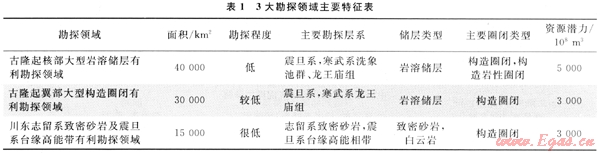 以上分析表明,四川盆地震旦系-下古生界具有有利的油氣成藏條件,資源潛力大,但勘探程度仍然很低,勘探前景廣闊。從勘探程度及研究、認(rèn)識(shí)程度綜合分析,主要有3大勘探領(lǐng)域,即古隆起核部大型巖溶風(fēng)化殼勘探領(lǐng)域、古隆起翼部大型構(gòu)造圈閉勘探領(lǐng)域和川東志留系致密砂巖及震旦系臺(tái)緣高能帶勘探領(lǐng)域,各領(lǐng)域的主要特征見(jiàn)表1。