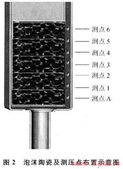 圖2為泡沫陶瓷及壓力測定點布置示意圖。用軟質材料包裹泡沫陶瓷,放置在鋼管中,保證泡沫陶瓷周邊與鋼管內表面的密封;在鋼管側面開有7個測壓孔,其間距為10mm。實驗中對測點A與其他6個測點的壓力差用數(shù)字微壓差計進行8次測量,取平均值;空截面風速由畢托管在實驗段出口處的不同位置也進行8次測量,取其平均值。實驗所采用的泡沫陶瓷規(guī)格為50mm×50mm×20mm,PPI分別為10、20、30,空隙率為88%。
