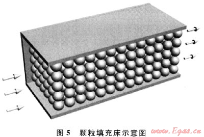 氣流在多孔介質中的流動阻力主要是由流體質點間存在相互牽制作用、流體與多孔介質的表面摩擦造成的。圖5為顆粒填充床示意圖。對于氣流在顆粒填充床與泡沫陶瓷中的流動,若兩者的比表面積及空隙率相等,可認為兩者的流動阻力是近似相等的。