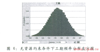 由表3知,資源約束條件下計(jì)算所得平均工期為194天,比PERT/CPM方法計(jì)算所得期望工期l85天較長(zhǎng),且分布范圍較寬,方差l6大于ERT/CPM方法所得工期方差l2也印證了在實(shí)際項(xiàng)目中工期會(huì)有較大波動(dòng)。模擬結(jié)果確定了項(xiàng)目在190天內(nèi)完成的概率為20.457%,即使提高模擬次數(shù),變化也不大,因而,可以認(rèn)為20.457%是規(guī)定時(shí)間內(nèi)相對(duì)精確的項(xiàng)目完成概率。同時(shí),可知本項(xiàng)目實(shí)際完成時(shí)間為193天,顯然本方法計(jì)算所得模擬工期更接近實(shí)際值。