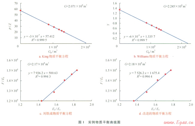 根據(jù)上述數(shù)據(jù),利用King物質平衡方程、williams物質平衡方程、劉鐵成物質平衡方程及筆者提出的改進的物質平衡方程,計算了該實例頁巖氣井的原始地質儲量(圖1)。