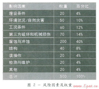 盡管危險辨識不能為風(fēng)險決策直接提供信息,但仍然是風(fēng)險分析的關(guān)鍵步驟。有時危險辨識分析能采用結(jié)構(gòu)技巧進行分析,有時危險辨識則不是系統(tǒng)地進行分析,而著重分析一些可能發(fā)生的危險。對于運行期管道,主要對影響管道壽命和管道運行安全的風(fēng)險進行分析。