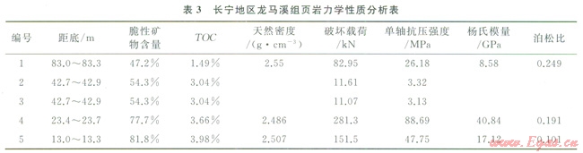 不同沉積亞相類型的頁(yè)巖中礦物組成結(jié)構(gòu)不同。龍馬溪組底部的深水陸棚相頁(yè)巖較其他層位的頁(yè)巖具有更高的脆性礦物含量。頁(yè)巖中石英的來(lái)源除了是細(xì)粒低變質(zhì)巖、風(fēng)化作用中粗顆粒的破碎、搬運(yùn)過(guò)程中的磨蝕以及黏土成巖過(guò)程中的石英之外,還包括生物成因蛋白石的重結(jié)晶[23]形成的生物成因石英礦物。龍馬溪組底部的頁(yè)巖主要來(lái)自于深水陸棚相沉積,深水陸棚相沉積中富含大量生物,含硅質(zhì)(如硅藻、放射蟲(chóng)、海綿骨針等)及碳酸鹽礦物的(如有孔蟲(chóng)和超微化石等)生物的富集提供了生物成因的脆性礦物,因此含有更高的脆性礦物。龍馬溪組頁(yè)巖有機(jī)質(zhì)越高,脆性礦物含量越高,具有較高的楊氏模量和較低的泊松比(表3),表明巖石脆性越好[13],越容易形成天然裂縫和人工誘導(dǎo)縫,可以有效改善儲(chǔ)層物性及提高壓裂的成功率。根據(jù)美國(guó)頁(yè)巖氣開(kāi)采經(jīng)驗(yàn),產(chǎn)氣層段主要是硅質(zhì)或鈣質(zhì)含量較高的細(xì)粒巖層,純泥巖或頁(yè)巖段幾乎不產(chǎn)氣,頁(yè)巖產(chǎn)氣率隨著脆性礦物含量的增加而增加。壓裂梯度與頁(yè)巖中的黏土、石英和碳酸鹽巖含量有關(guān)[24]。在人工壓裂中富含硅質(zhì)的頁(yè)巖要比富含黏土質(zhì)頁(yè)巖更容易被壓裂[25]。
