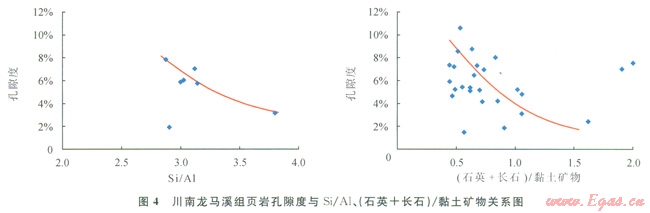 龍馬溪組頁(yè)巖Si/Al高的總孔隙體積相對(duì)較低,隨著硅酸鋁含量的增加,Si/Al降低,孔隙度增加(圖4)。黏土礦物含量與頁(yè)巖孔隙度呈正相關(guān)[21],富含黏土礦物(低Si/Al比)的頁(yè)巖要比富含硅質(zhì)(高Si/Al比)的頁(yè)巖總孔隙度大,這與黏土礦物中鋁硅酸鹽的開(kāi)放孔隙有關(guān)。根據(jù)前人研究結(jié)果,富含黏土礦物(低Si/Al比)的頁(yè)巖孔隙直徑小于10nm,呈單峰分布,總孔隙度為5.6%,而富含硅質(zhì)(高Si/Al比)頁(yè)巖無(wú)微孔和中孔,總孔隙度為1%[22]。