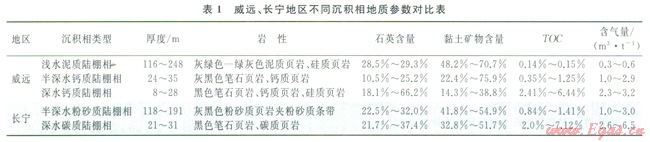 頁(yè)巖沉積物源及沉積相的差異,造成在區(qū)域上礦物組成的差異較大。長(zhǎng)寧地區(qū)的深水陸棚相脆性礦物含量相對(duì)威遠(yuǎn)地區(qū)高一些,平均在75.9%~84.3%,其中石英含量介于21.7%~37.4%,含氣量相對(duì)較高,主要分布在2.6~6.5m3/t。而威遠(yuǎn)地區(qū)的深水陸棚相頁(yè)巖脆性礦物含量為21.3%~66.6%,石英含量介于18.1%~66.2%,含氣量為2.3~3.2m3/t。半深水陸棚相頁(yè)巖的礦物組成含量規(guī)律與深水陸棚相基本相同,長(zhǎng)寧地區(qū)半深水陸棚頁(yè)巖的脆性礦物含量要比威遠(yuǎn)地區(qū)略高,平均在37.4%~58.2%,其中石英含量介于22.5%~32.0%,具有較高的含氣性,含氣量介于1.0~3.0m3/t。而威遠(yuǎn)地區(qū)的深水陸棚相頁(yè)巖脆性礦物含量在18.1%~31.2%,石英含量介于l0.5%~25.2%,含氣量介于1.0~2.9m3/t,含氣性與長(zhǎng)寧地區(qū)大致相當(dāng)。淺水陸棚相只發(fā)育在威遠(yuǎn)地區(qū),長(zhǎng)寧地區(qū)缺失。威遠(yuǎn)地區(qū)的淺水陸棚主要為泥質(zhì)沉積物源,泥質(zhì)含量極高,脆性礦物含量較少,僅有29.3%~31.8%,其中石英含量為28.5%~29.3%。