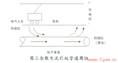 2)雜散電流。所謂雜散電流是指沿規(guī)定回流以外流動(dòng)的電流。雜散電流流出的地方成為腐蝕電池的陽極區(qū),腐蝕破壞就發(fā)生在這個(gè)地方,金屬損失量與流過的雜散電流的電量成正比,符合法拉第定律,即一安培電流流過一年就相當(dāng)于約九公斤的鐵發(fā)生電化學(xué)腐蝕而溶解掉了,可見雜散電流引起的腐蝕是相當(dāng)嚴(yán)重的。