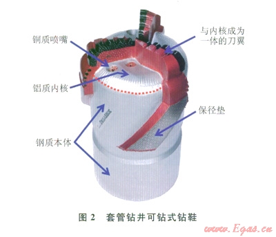 水眼上可以安裝由銅或陶瓷材料制成的、具有可鉆性的噴嘴,噴嘴的直徑從7.9375mm到25.4mm,可供選擇。由于內(nèi)核、刀翼以及噴嘴都是由可鉆性好的材料制成,因此鉆鞋可以被常用的牙輪鉆頭或PDC鉆頭從內(nèi)部鉆穿。