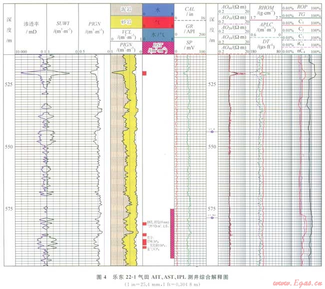 為了提高薄氣層厚度的解釋精度,引進(jìn)陣列感應(yīng)測(cè)井[12](Array Induction Tool,簡(jiǎn)稱AIT)、方位電阻率測(cè)井[13](Azimuthal Resistivity Imager,簡(jiǎn)稱ARI)、綜合孔隙度測(cè)井(Integration Porosity Log,簡(jiǎn)稱IPL)提高了薄層厚度的解釋精度。如圖4中在519.7~521.4m,氣層段由于侵入影響AO90電阻率值明顯高于常規(guī)感應(yīng)電阻率值6W·m左右;而在580.0~591.0m氣層段為砂泥巖交互層段AO90電阻率曲線明顯顯示了砂泥巖薄互層的特性,薄砂層電阻率明顯高于常規(guī)感應(yīng)電阻率值,而常規(guī)感應(yīng)電阻率曲線只反映了薄互層的平均電阻率值,同時(shí),AST、IPL等曲線也顯示了與之對(duì)應(yīng)的砂泥巖薄互層的特性。