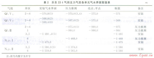 由于含氣砂巖明顯的低速特征,在模糊區(qū)之外氣層的亮點(diǎn)或極性反轉(zhuǎn)等都非常清楚(圖5)。在南區(qū)可以看到氣層的平點(diǎn)特征,而薄層一般可見明顯的極性反轉(zhuǎn)現(xiàn)象。實(shí)鉆資料和壓力推算證實(shí),這一地震信息是可以確定各氣藏的含氣范圍的。如Ql1V上氣組的氣水界面,壓力推測(cè)為-573m,亮點(diǎn)為-575m,實(shí)鉆為-570.8m,基本一致(表2);另外,利用試井分析結(jié)果明確斷層位置,確定合理含氣范圍。如N2y1I氣組6井區(qū)和3、5井區(qū)兩個(gè)單元經(jīng)井證實(shí)氣水界面和氣體組分均有差異,但由于模糊區(qū)的存在,兩個(gè)井區(qū)之間疑似有一條走向近南北的斷層,通過2、6井的試井解釋,均顯示有不滲透邊界的存在,證實(shí)了“模糊區(qū)”內(nèi)F4斷層的存在,為合理確定這兩個(gè)計(jì)算單元的含氣范圍提供了依據(jù)。