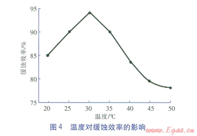 由圖4可以看出,烏洛托品對碳鋼的緩蝕效率先是隨溫度的升高而增大,達(dá)到極大值94.6%后開始下降,因此在25~35℃溫度范圍內(nèi)進(jìn)行清洗可以達(dá)到較好的緩蝕效果。