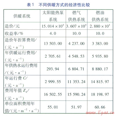 由表l可知,對于單位面積費用年值,太陽能熱泵系統(tǒng)比燃?xì)夤嵯到y(tǒng)高5.5%,比燃油供熱系統(tǒng)低10.3%。但是綜合考慮環(huán)境保護(hù)、能源消耗、系統(tǒng)可調(diào)性和長期回報,太陽能熱泵低溫輻射供暖系統(tǒng)還是具有較大的市場潛力。