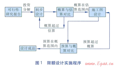 限額設計是按照批準的可行性研究報告和投資估算控制初步設計,按照批準的初步設計總概算控制施工圖設計,保證總概算不被突破。限額設計實施程序見圖1。