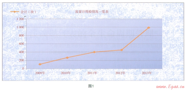 (1)目前合肥燃?xì)饧瘓F(tuán)已發(fā)展工商用戶2000余戶,在線使用的流量計(jì)有3800余塊表(其中羅茨、渦輪流量計(jì)占到2400余塊,現(xiàn)每月還在以20塊左右遞增),工商戶的用氣量占到60%以上。為加強(qiáng)流量計(jì)的管理,合肥燃?xì)庥?span lang="EN-US">2010年初把工商戶流量計(jì)全部交南營(yíng)銷公司統(tǒng)一歸口管理,營(yíng)銷公司成立專門部門,專項(xiàng)負(fù)責(zé)工商用戶的抄表、收費(fèi)、巡檢、維護(hù)、周檢、技改等工作。為了使流量計(jì)始終處于正常運(yùn)行狀態(tài),避免因表具長(zhǎng)期在線運(yùn)行造成計(jì)量偏差(主要是負(fù)偏差),合肥燃?xì)鈱?duì)在線運(yùn)行的流量計(jì)周期檢定工作非常重視,尤其是2010年機(jī)構(gòu)職能調(diào)整后每年對(duì)到期流量汁的周槍數(shù)量都有硬性規(guī)定,隨著新增用戶的增加還在逐年遞增。見(jiàn)圖l。
