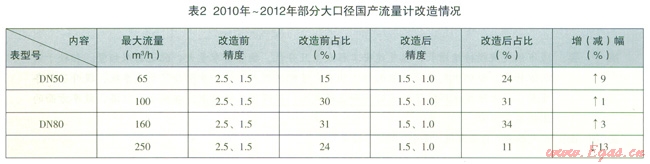 (2)在流量計(jì)的的生命周期管理中對(duì)于已經(jīng)老化影響到表具正常運(yùn)行和計(jì)量的必須進(jìn)行必要的改造和更換,以保證其生命力。合肥燃?xì)夤ど逃脩?span lang="EN-US">2009年前使用的多為國(guó)產(chǎn)系列的流量計(jì),在2006年前還大量使用了精度為2.5級(jí)流量計(jì),計(jì)量誤差大,穩(wěn)定性差,且使用的故障率高,降低了表具的計(jì)量精度,影響到供銷差率的控制。針對(duì)這種情況,合肥燃?xì)饷磕晗聯(lián)軐m?xiàng)資金組織人員有重點(diǎn)對(duì)老舊表具進(jìn)行改造,一是對(duì)2.5級(jí)表進(jìn)行更換成1.5級(jí)~l.0級(jí)表,二是根據(jù)用戶現(xiàn)有灶具用量進(jìn)行測(cè)算對(duì)DN50、DN80表流量范圍進(jìn)行重新界定,更換成流量范同更適合的表具或選擇口徑小一級(jí)的表具進(jìn)行計(jì)量。見(jiàn)表l、表2。