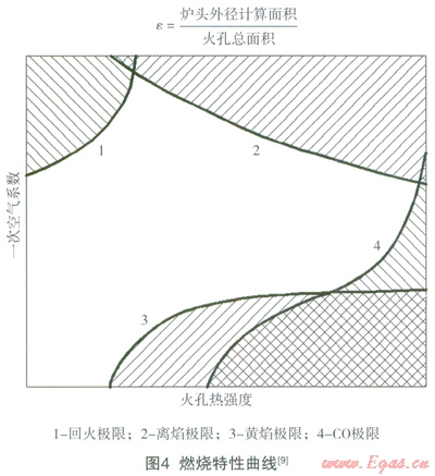 對(duì)于大氣式燃燒器,其典型燃燒特性曲線如圖4所示。,當(dāng)氣源氣質(zhì)發(fā)生變化時(shí),燃燒器設(shè)計(jì)火孔熱強(qiáng)度過大,極易出現(xiàn)CO排放問題;而設(shè)計(jì)一次空氣系數(shù)過大且火孔熱強(qiáng)度過小,燃燒器容易發(fā)牛回火,火孔熱強(qiáng)度設(shè)計(jì)過大則易導(dǎo)致離焰;對(duì)于一次空氣系數(shù)過小的燃燃燒器爐頭,選擇合適的設(shè)計(jì)工況點(diǎn)(一次空氣系數(shù)和火孔熱強(qiáng)度),將直接影響燃燒器應(yīng)對(duì)氣源氣質(zhì)變化的適應(yīng)能力。另一方面,火孔尺寸過大、火孔間距過小、爐頭外徑偏小,易使得火孔分布緊密、火焰變軟連焰,從而導(dǎo)致CO排放增加、熱效率降低;反之則火孔過于分散、火焰較硬、傳熱效果變差,熱效率不理想,某些情況同樣會(huì)導(dǎo)致燃燒不完全,出現(xiàn)污染物排放問題[10]。就此,根據(jù)上面爐頭設(shè)計(jì)參數(shù)統(tǒng)計(jì)結(jié)果,本文定義一無因次參數(shù)e來綜合捕述民用灶具爐頭火孔大小、間距、個(gè)數(shù)同爐頭大小的關(guān)系,從而評(píng)價(jià)爐頭設(shè)計(jì)情況: