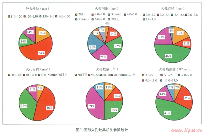 本文通過對(duì)65臺(tái)目前中國(guó)燃具市場(chǎng)上常見的民用大氣式燃?xì)庠罹郀t頭進(jìn)行調(diào)研,著重統(tǒng)計(jì)分析了目前中國(guó)灶具廠商出廠的各類灶具爐頭的不同火孔類型、火孔尺寸、火孔間距、火孔數(shù)量、火孔熱強(qiáng)度以及灶具額定熱負(fù)荷等數(shù)據(jù),并對(duì)部分樣本灶具進(jìn)行不同氣質(zhì)情況下的熱效率和CO排放性能分析,以驗(yàn)證不同爐頭設(shè)計(jì)對(duì)氣源氣質(zhì)變化的適應(yīng)能力。
