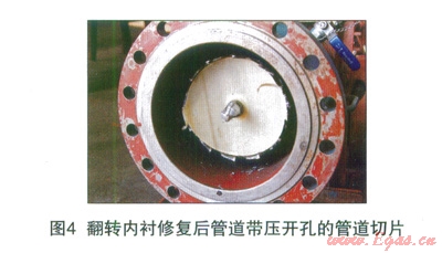 焊接開(kāi)孔試驗(yàn)結(jié)束后,試驗(yàn)樣管及孔片經(jīng)過(guò)了多方的共同觀察和分析。試驗(yàn)結(jié)果顯示,在嚴(yán)格控制熱影響措施下,焊接時(shí)產(chǎn)生的熱量對(duì)翻入管道內(nèi)的starlineÒ內(nèi)襯材料及固化后的粘合劑影響很小,對(duì)內(nèi)襯與管壁的粘接強(qiáng)度影響微乎其微;另外,模擬帶壓開(kāi)孔試樣結(jié)果顯示,開(kāi)孔處內(nèi)襯切口平整、粘接牢固,切割出孔片上內(nèi)襯完整、無(wú)毛邊、無(wú)脫落現(xiàn)象。