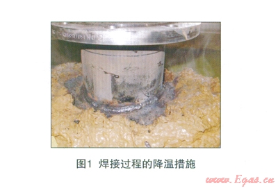 在焊接Fitting過(guò)程中,溫度監(jiān)控及降溫措施尤為重要。焊接時(shí),在焊縫周邊至少連接4個(gè)感應(yīng)器對(duì)溫度進(jìn)行測(cè)量監(jiān)控,并進(jìn)行相應(yīng)的降溫措施,比如覆蓋含水量適中的粘土或液體冷卻袋于焊接處周邊,有效阻止降低焊接溫度在母管上的傳導(dǎo)。運(yùn)用不同廠家生產(chǎn)的內(nèi)襯材料,感應(yīng)器與焊縫間、降溫物質(zhì)與焊縫間的距離設(shè)置各不相同,通過(guò)溫度感應(yīng)器測(cè)量得到的最高允許溫度值也不同。