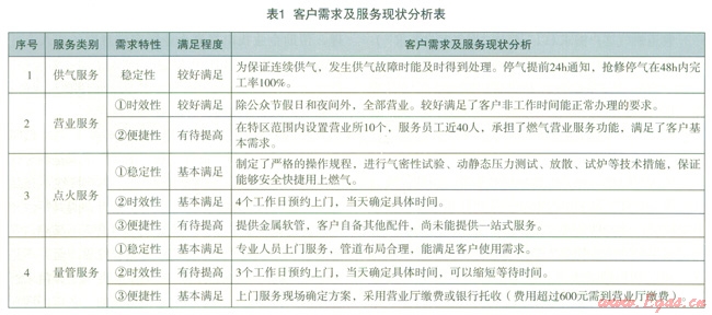 在通過上門服務(wù)、專項(xiàng)調(diào)查、定期走訪、業(yè)務(wù)回訪、服務(wù)熱線、營(yíng)業(yè)咨詢、市長(zhǎng)熱線、民心橋等多種信息收集手段的基礎(chǔ)上,對(duì)l0大服務(wù)類別的3層次需求特性進(jìn)行滿足度分析(見表l)。細(xì)分各項(xiàng)服務(wù)滿足客戶需求程度是尋找服務(wù)改善點(diǎn)的基礎(chǔ)。