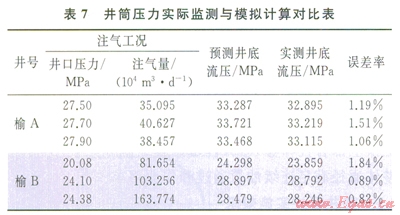 榆林南注采試驗(yàn)井榆A和榆B井注氣過程中,井筒壓力損失分析見表7所示,計(jì)算壓力損失與實(shí)測的誤差小于2%?,F(xiàn)場試驗(yàn)表明,室內(nèi)節(jié)點(diǎn)分析軟件模擬計(jì)算結(jié)果符合氣井實(shí)際運(yùn)行工況。