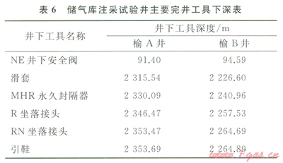 榆林南儲(chǔ)氣庫注采試驗(yàn)井榆A和榆B采用井下懸掛壓力汁測壓完井管柱。榆A井采用Æ114.3mm油管,完井管柱全井段最小內(nèi)徑67.7mm(RN坐落短節(jié)處);榆B井采用Æl39.7mm油管,完井管柱全井段最小內(nèi)徑112.9mm(RN坐落短市處)。完井工具入井前測試合格,完井管柱下入施工順利,封隔器一次坐封、試壓及功能測試正常。完井后鋼絲作業(yè)和連續(xù)油管儲(chǔ)層改造管柱通過順暢。