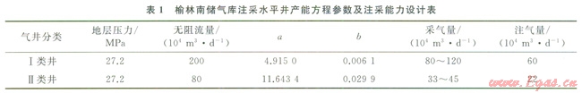 由于儲(chǔ)層非均質(zhì)性強(qiáng),氣井產(chǎn)能存在差異,榆林南儲(chǔ)氣庫注采井按照采氣量2類井(表1)設(shè)計(jì)。氣井二項(xiàng)式產(chǎn)能方程[2]如下: