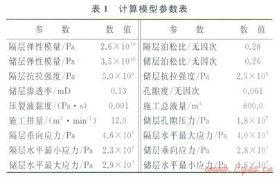 根據(jù)西南某地區(qū)的部分壓裂井的微地震監(jiān)測和測井解釋結果,發(fā)現(xiàn)該區(qū)塊的天然裂縫不發(fā)育,壓裂過程中,壓裂裂縫以平面裂縫為主,因此,本計算模型假設壓裂裂縫為平面縫。