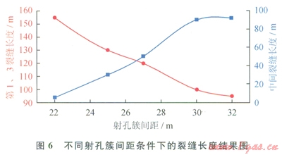 根據(jù)改造儲層的物性參數(shù)以及相鄰水平井的壓裂施工參數(shù),對要優(yōu)化的水平井進行了“分段多簇”壓裂裂縫擴展模擬,不同射孔簇間距條件下得到的壓裂裂縫長度如圖6所示(考慮對稱性,兩端射孔簇的裂縫在圖中只畫一條曲線):當射孔間距為22.0m時,中間射孔簇的壓裂裂縫基本沒有壓開,只形成了很短的壓裂裂縫。當射孔簇間距為30.0m時,中間的射孔簇形成的壓裂裂縫和兩端射孔簇形成的壓裂裂縫基本相當。因此,壓裂設計過程中,射孔簇的間距設定在30.0m左右比較合適,根據(jù)射孔簇間距參數(shù),每個壓裂段的長度確定為90.0m,壓裂段數(shù)為ll段。