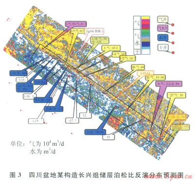 反演得到預(yù)測區(qū)域目的層泊松比均值分布圖(圖3),紅、黃色代表含氣,綠、藍(lán)色代表含水,灰、白色代表非儲層。圖3中指示框的顏色為含流體類別(氣、氣水、水),其中的數(shù)據(jù)為產(chǎn)量??梢钥吹?,預(yù)測的氣水分布與試油結(jié)果基本對應(yīng),效果較明顯,26口井有21口符合,符合率81%。