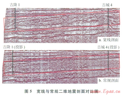 2008年首次在臺盆區(qū)沙漠腹地開展寬線攻關(guān),采集了2條共l47km的寬線,一條是古隆1—古城4井的連井剖面,一條是過古城6號構(gòu)造的近南北向剖面。寬線攻關(guān)目的有兩個:①尋找層間巖溶儲層的地震依據(jù);②降低三維地震部署風(fēng)險。實施效果表明寬線攻關(guān)效果顯著,主要表現(xiàn)為資料品質(zhì)有較大程度改善,古城4與古隆地區(qū)油氣顯示層位大體相當(dāng)(圖5),大大提高該區(qū)的地質(zhì)認識,為三維地震部署提供了依據(jù)。