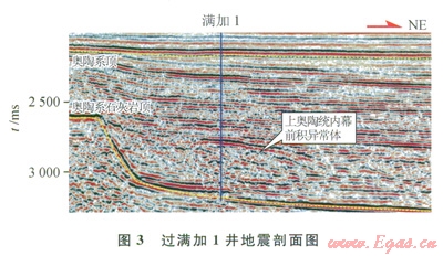 3)上奧陶統(tǒng)斜坡~陸棚相濁積巖在地震剖面上表現(xiàn)為異常反射或內(nèi)幕強反射,曾是多l5井的兼探層系。1995—2003年,通過塔中28、塔中29、塔中32、塔中33、滿南1等5口探井實鉆,認為除塔中33井上奧陶統(tǒng)內(nèi)幕強反射被證實為玄武巖外,其他內(nèi)幕強反射異常體皆為濁積砂巖沉積特征。2006年,發(fā)現(xiàn)滿加1井上奧陶統(tǒng)內(nèi)幕異常反射體,并認為是濁積砂巖沉積,針對上奧陶統(tǒng)濁積砂巖巖性圈閉鉆探滿加1井(圖3),實鉆表明上奧陶統(tǒng)內(nèi)幕異常反射與強反射是泥質(zhì)灰?guī)r的響應(yīng),以失利告終。盡管其間也有部分井鉆遇奧陶系碳酸鹽巖,也均未獲得突破。