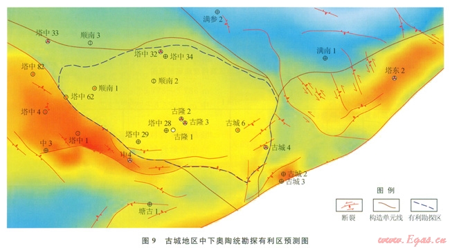 3)古城低凸起下古生界碳酸鹽巖油氣保存條件優(yōu)于塔中。古城地區(qū)發(fā)育上奧陶統(tǒng)區(qū)域性蓋層,上奧陶統(tǒng)卻爾卻克組以泥巖沉積為主,厚度介于l000~1800m,在該區(qū)廣泛分布。巨厚的泥巖層可有效阻止下部油氣的散失,為該區(qū)下古生界碳酸鹽巖油氣藏的保存提供了屏障。
