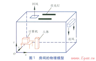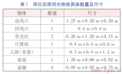 房間的物理模型見圖1,房間的長×寬×高為3.40m×2.90m×2.95m。房間圍護(hù)結(jié)構(gòu)視為絕熱,送風(fēng)裝置安裝于側(cè)墻上部,送風(fēng)口高度為2.2m。回風(fēng)口位置見圖l,尺寸為0.4m×0.4m。模型房間內(nèi)有2盞熒光燈,電功率均為36W。人體、計(jì)算機(jī)等熱源靠近回風(fēng)口一側(cè)的墻邊,人體和計(jì)算機(jī)的發(fā)熱量分別為l00W/人、300W/臺(tái)。將房間內(nèi)的人體、計(jì)算機(jī)、桌子等分別簡化成規(guī)格不同的立方體,簡化后房間內(nèi)物體具體數(shù)量及尺寸見表1。